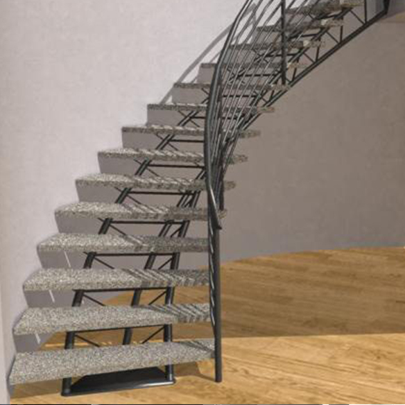 Coupling style with sturdiness, the double stringer curved stair is excellent for both interior and exterior applications. This type of stair is flexible in design and can be easily molded to fit contemporary and modern layouts.